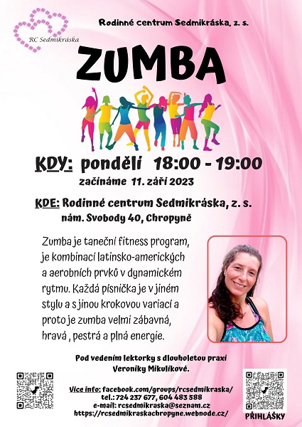 Zumba je taneční fitness program, který spojuje latinskoamerické rytmy a aerobní prvky do jedinečné, energické lekce. Každá písnička má jiný styl, jinou choreografii – proto je Zumba zábavná, pestrá a nikdy se neomrzí.