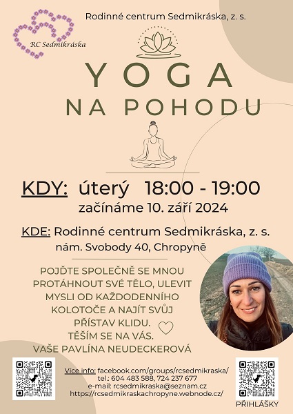 Cvičíme v klidném tempu, s ohledem na možnosti každého účastníka. Přidejte se k nám a dopřejte svému tělu i mysli to, co si zaslouží – pozornost, péči a rovnováhu.