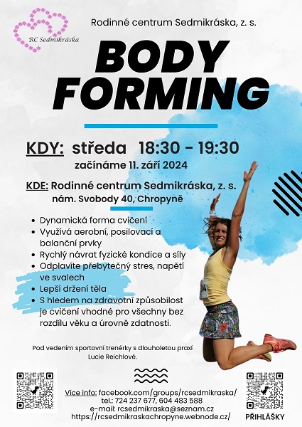 Hledáte efektivní a zároveň zábavné cvičení, které vám pomůže dostat se do kondice, zpevnit tělo a zároveň si psychicky odpočinout? Přijďte na Body Forming – dynamickou lekci, která kombinuje aerobní, posilovací a balanční prvky do jednotlivých sestav (bloků).